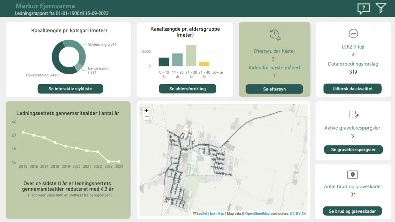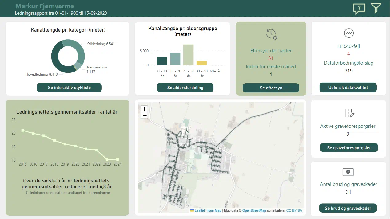 Uanset om du har brug for det helt brede perspektiv – eller du vil dykke ned i data om de enkelte ledninger i jorden – kan du nemlig let skifte mellem visningerne i rapporten. Med andre ord bliver det langt nemmere for dig at arbejde både strategisk og operationelt med din forsynings ledningsdata.